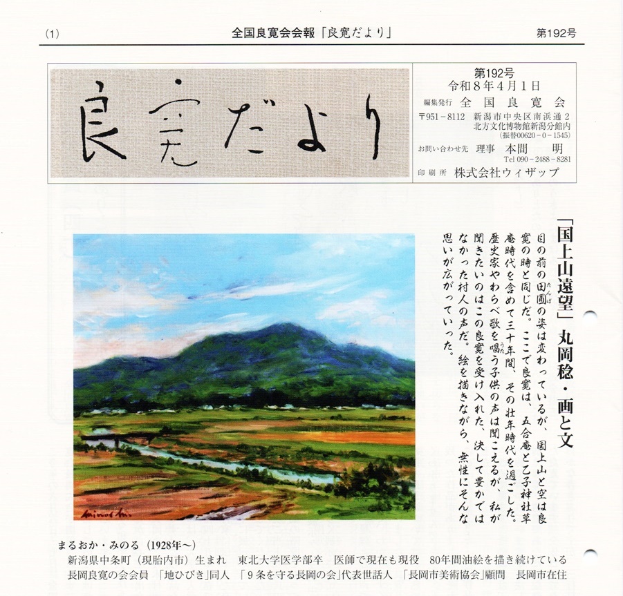 あけましておめでとうございます 皆様におかれましては、佳き年をお迎えのこととお慶び申上げます。 さて、私たちは毎日のように世界中のニュースや話題で膨大な情報を浴びて生きている難しい世相におります。幸い今年は全国良寛会長岡大会の開催が大きな活動目標として掲げることになりました。 実行委員会の皆さんのご協力で準備も予定通りに進行しており、クマなど動物・植物も葉を落とし冬眠中でしょうか、私たちもこの長い冬で計画を整えて、芽吹きの春から青葉若葉の美しい初夏の良寛の里にて県内外の良寛ファンの皆様をお迎えしたいものです。 会員の皆様には体調に留意され、一層のお力添えをお願い申し上げます。 令和8年1月 長岡良寛の会会長 安達武男 |